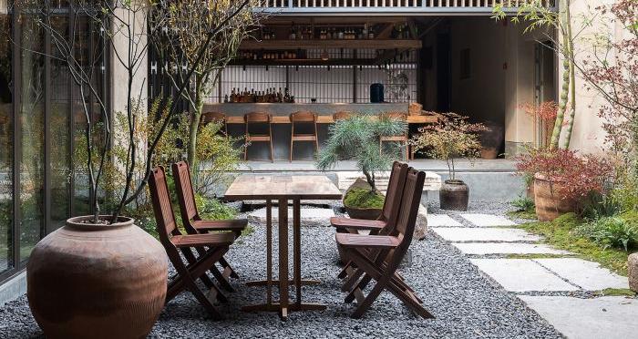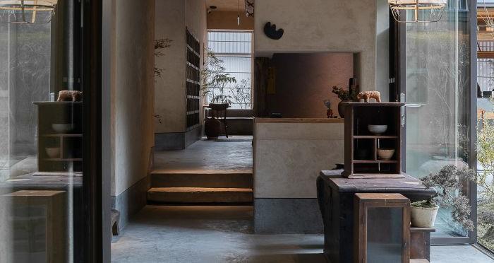 元古雲(yún)境是中國(guó)西南地區(qū)的首店,也是成都的第一家店。餐廳位于成都太古里的二樓和三樓,通過樓梯進(jìn)行連接。入口設(shè)計(jì)采用老石板和老木板,給人一種沉穩(wěn)且神秘的感覺。三樓平臺(tái)上有一個(gè)精致的小院,與自然更加親近。營(yíng)業(yè)區(qū)分為廚房、包間、洗手間、吧臺(tái)、院子和散臺(tái)區(qū)。吧臺(tái)、院子和散臺(tái)區(qū)互為景觀,相互依存。洗手間和包間位于廚房的角落,可以控制成本,減少干擾。散臺(tái)區(qū)相對(duì)獨(dú)立,安靜,讓人更加愜意。設(shè)計(jì)的靈感來自于元古精神,即簡(jiǎn)單、自然、溫暖。在解決動(dòng)線問題、空間利用率、節(jié)能和光線等問題后,自然形成了這種設(shè)計(jì)。