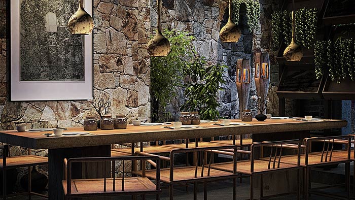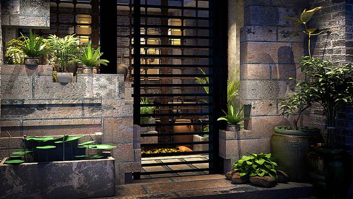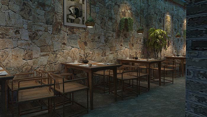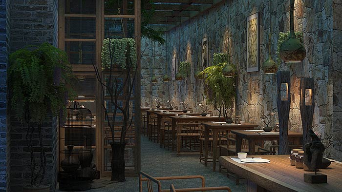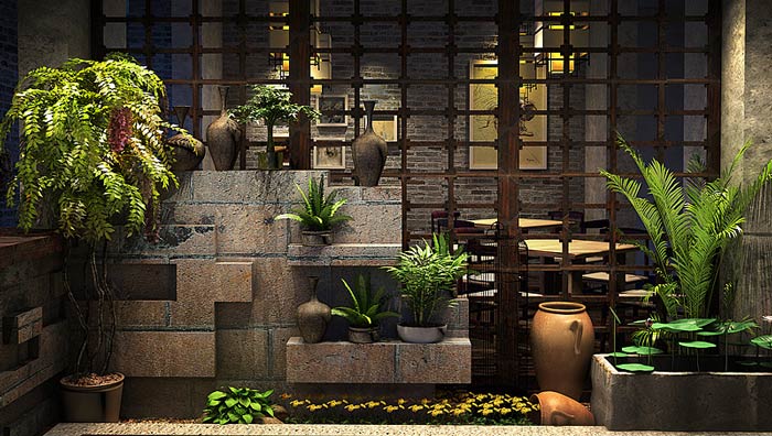 主題餐廳中庭設(shè)計:此處是連接室外與室內(nèi)的過渡區(qū)域,在這里客戶感受到的是自然、舒適,這也正是設(shè)計師希望看到的,設(shè)計師希望客戶對這里充滿期待。