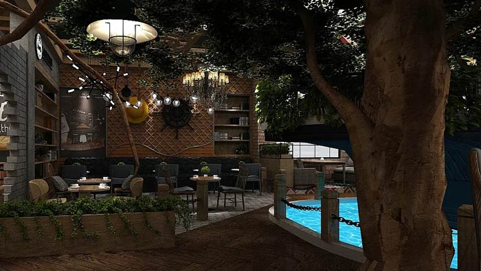 主題餐廳餐區(qū)設(shè)計:餐區(qū)圍繞水池分布,水池旁邊有樹、綠植,因為有水所以空間空氣格外清新,在這里就餐讓我們好似在露營,在大自然之中享受美食。