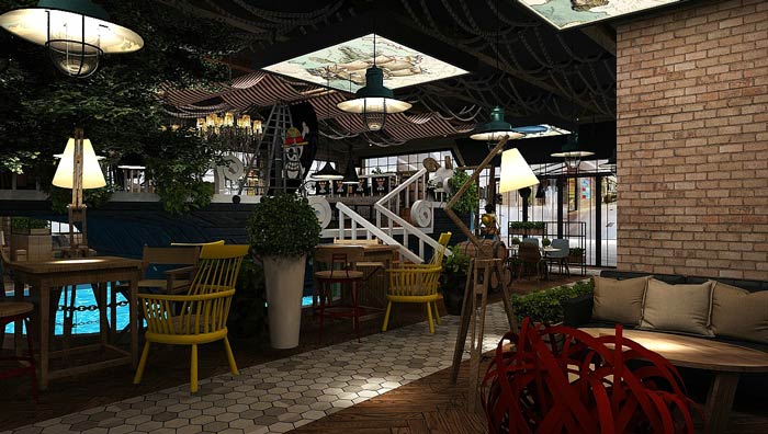 主題餐廳海盜船設(shè)計:船體漂浮在水面上,客戶在來回晃蕩的船體上就餐,讓客戶感受到在區(qū)別于陸地的感覺,空間的裝飾讓人感覺,好似回到了海賊王時代。
