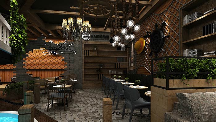主題餐廳設(shè)計方案:海盜船安置在空間的左側(cè)區(qū)域,空間的裝飾與布置也參考了海賊王當(dāng)中的布置,設(shè)計師要做的就是最大程度的還原,讓大家在這里走入冒險尋寶之中。