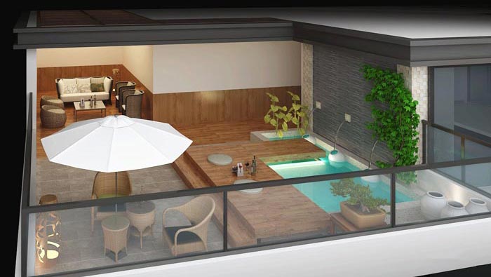 頂層溫泉的設(shè)計:此處主要是為勞累了一天的客戶們,提供一處休閑之地,讓大家在這里可以泡泡澡、喝喝茶、嘮嘮嗑、談?wù)勆?,在這里休閑達到一種頂峰,此處旨在去除人的疲勞,此處也是酒店的一大亮點,酒店的理念就是在任何時候,都可以為客戶帶來驚喜。