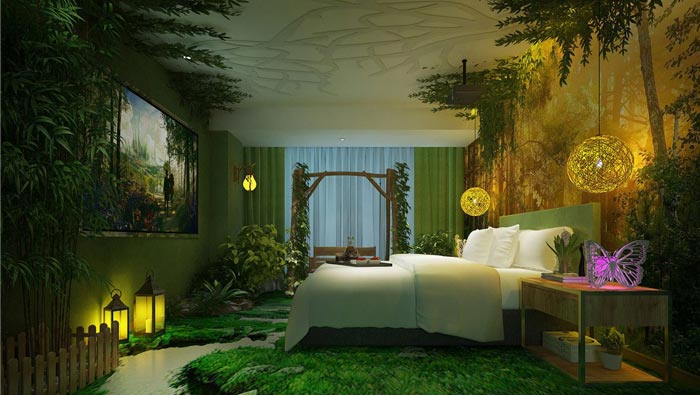童話客房的設(shè)計(jì):第一眼仿佛進(jìn)入了一個(gè)童話世界,在森林的盡頭住著一對(duì)夫婦,在這里快樂(lè)的生活、無(wú)憂無(wú)慮、日出而作、日落而寫,過(guò)著美滿的生活,這不正是我們所向往的生活嗎,浪漫又樸實(shí),設(shè)計(jì)師希望讓情侶之間可以多一些理解、多一些包容。