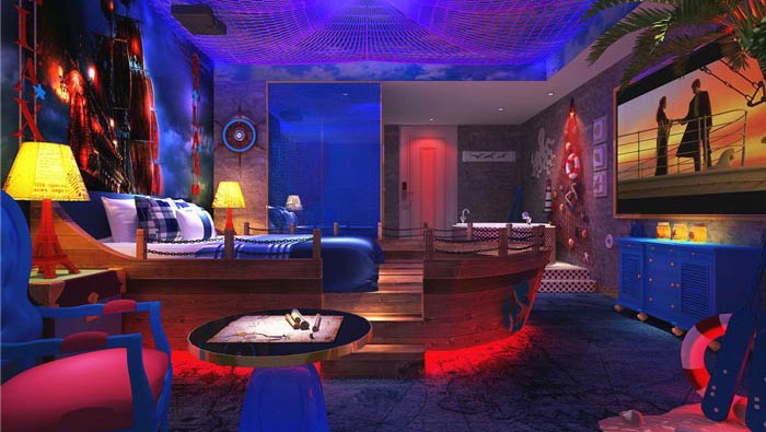 海盜船客房的設(shè)計(jì):此處說(shuō)起來(lái)是海盜船,但是設(shè)計(jì)師的取景不同,設(shè)計(jì)師取得不是人物,而是夜晚美麗的景色,在漫漫大海中我們隨風(fēng)飄蕩,頂部好像夜晚降臨的星空,在這里我們相互依偎,在這里我們看著彼此,在這里我們聽(tīng)著海洋、星空的祝福,這不正是我們期待的浪漫星空。