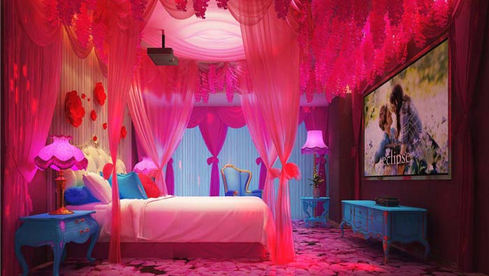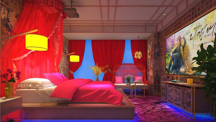 喜慶客房的設(shè)計(jì):此處粉紅色成為主角,在這里是一個(gè)粉紅的世界,情侶們?cè)谶@里仿佛脫離了世界一般,來(lái)到了一個(gè)全新的星球之中,在這里他們浪跡天涯,在這里他們相互依偎,客房的含義重在折射出內(nèi)心的希望,也意在促進(jìn)雙方內(nèi)心的互動(dòng)。