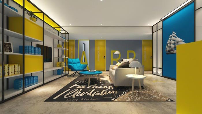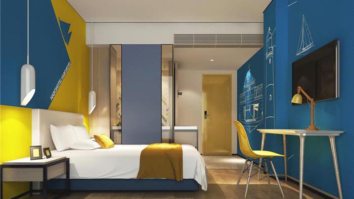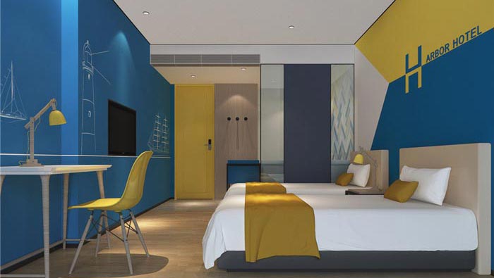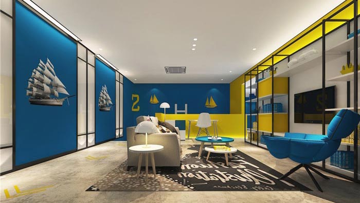 雙人間的設(shè)計(jì):空間以藍(lán)黃兩色為主,就是希望打造一個(gè)簡(jiǎn)約、時(shí)尚的住宿空間,仿木紋的地板、玻璃隔斷以及由花磚拼接而成的墻面裝飾,種種設(shè)計(jì)都是為了給客戶營(yíng)造一種強(qiáng)烈的層次感和時(shí)尚感,其中藍(lán)色海洋與帆船,寓意著如家一般的溫馨港灣。