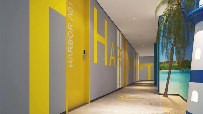 過(guò)道的設(shè)計(jì):引導(dǎo)線加上燈塔為我們指引了方向,讓我們更加具象的了解燈塔的作用,同時(shí)風(fēng)景宜人的墻畫(huà)讓我們仿佛置身于海島之中,讓客戶在此處可以感受到海洋的魅力,讓大家對(duì)于海洋有更多的憧憬,客戶所需正是酒店所求,這也是此次設(shè)計(jì)的目標(biāo),讓更多的人了解自己、認(rèn)識(shí)自己,以此去尋找那屬于自己的心靈港灣。