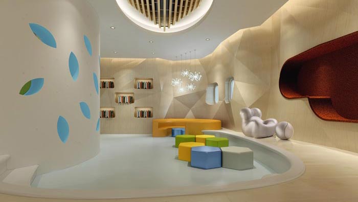 閱讀池的設(shè)計(jì):此處位于空間的正中央,整個(gè)閱讀池或坐或躺,既可以滿足孩子的閱讀,也可以讓孩子在此處玩耍,同時(shí)保證孩子的安全,階梯狀的座椅讓孩子可上可下,可以鍛煉孩子的獨(dú)立自主,同時(shí)此處可以欣賞到整個(gè)空間的景色,在此處本身就是一種享受。