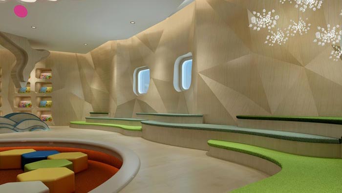 休息區(qū)域的設(shè)計(jì):此處位于空間的一側(cè),設(shè)計(jì)師在設(shè)計(jì)中將其設(shè)計(jì)成階梯式,即增強(qiáng)了空間的容納能力,同時(shí)也充分考慮到孩子的興趣與愛(ài)好,對(duì)于階梯相信很多孩子都有很大的興趣,或上火下或休息讓孩子自己決定,企業(yè)的目的就是不強(qiáng)加給孩子任何負(fù)擔(dān),培養(yǎng)孩子自主的能力。