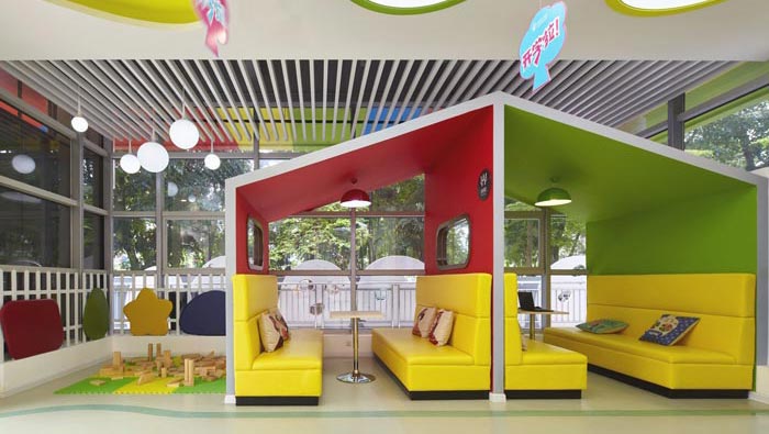 休息與洽談區(qū)的設計:此次位于前臺空間的左前方,目的就是希望此地承載起接待的作用,讓客戶在此處可以感受到企業(yè)的辦學理念,空間的色彩設計師以活潑、鮮艷為主,同時空間格局以半開放式的形式展現(xiàn)出來,同時簡易的小房子模型也給客戶一種家的感覺,積木的堆砌為孩子提供了一個玩耍的區(qū)域。