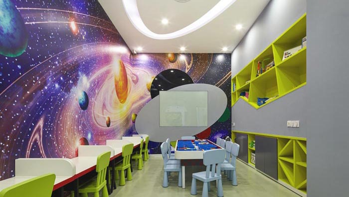 教學空間的設計:此空間一共有5位同學,在空間格局上分別為學習區(qū)與實踐區(qū),墻壁的一面使用星系壁紙,這樣就為學習區(qū)域創(chuàng)造了可能,因為星系本身就有弱化視覺的效果,讓人感受到星系的浩瀚,而忽略墻壁這個真實的存在,實踐區(qū)在于鍛煉孩子動手的能力,讓孩子們健康快樂的成長。
