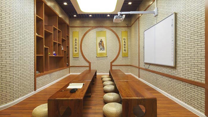 古學區(qū)域的設計:此處可以容納12位學員,此處的目的不在于學習,而在于培養(yǎng)孩子學習的興趣,讓孩子們從小就對古代圣賢有一個直接的了解,為未來的學習奠定基礎,孔子是中國歷史上偉大的教育家、思想家,設計師希望孩子可以從小去熟悉他,并以他為榜樣不斷進步、不斷學習、不斷自勉。