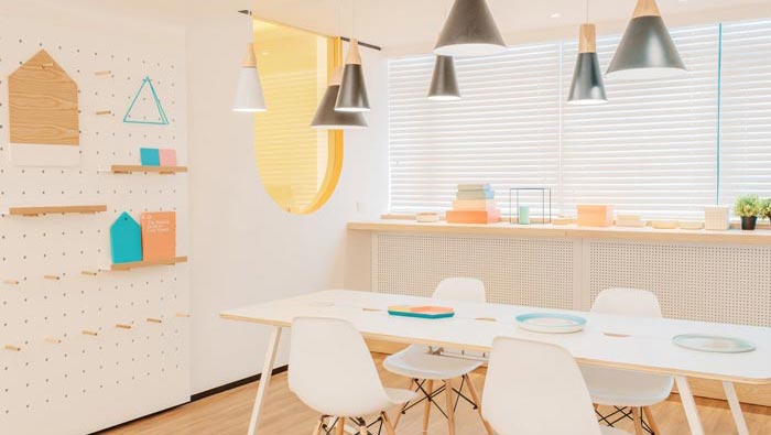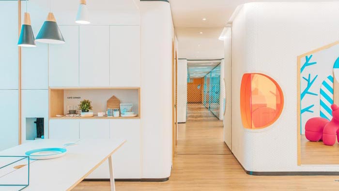 前臺區(qū)域的設計:設計師在設計的時候,采用白色做為主色調,其中加入了藍色、褐色等各種色彩,白色為主色調給人一種溫暖、明亮的感覺,其他顏色做為點綴之用,白色本身就有向外散發(fā)的屬性,可以在一定程度上提升空間的視覺感受。