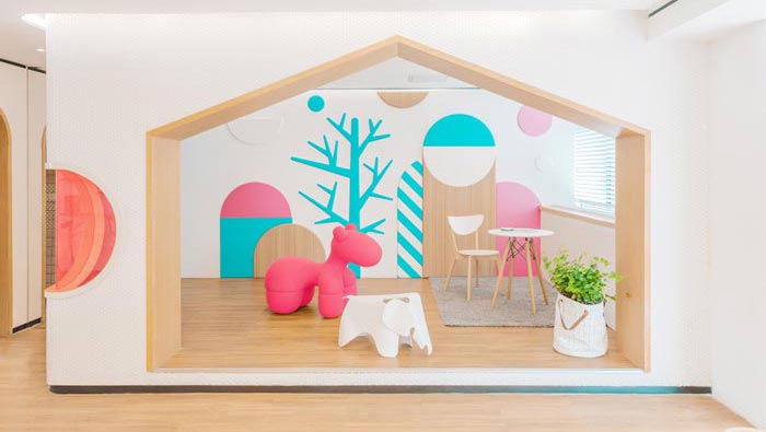 接待區(qū)域的設計:在設計上設計師加入了調皮、溫馨的元素,但是在元素的控制上設計師顯得十分小心,讓彼此之間都不會感到反感,因為不管對于孩子還是對于大人來說,對于元素的認可度都是不同的,所以設計師做了多次調研,最后將其控制在一定的比例之內,讓大人、小孩感受的元素是完全不同的。