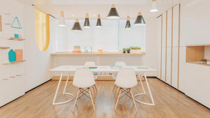 茶水間的設計:看到此處不得不感嘆設計師的創(chuàng)意,設計師在墻壁中掏出了一個壁櫥,以此滿足茶水的需求,在高度的設置上也有所控制,剛好控制在孩子夠不到的地方,即滿足了需求又避免了孩子的直接接觸,小空間配上一個如此迷你的茶水壁櫥,感覺真是卡哇伊。