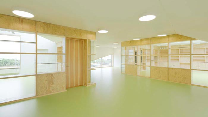 教室內(nèi)部的設(shè)計(jì):內(nèi)部有膠合板制成的“書柜墻”圍繞在空間的四周,與綠色地板一起構(gòu)成了整個(gè)空間的格局,這樣的設(shè)計(jì)為整個(gè)空間創(chuàng)造出,流暢的空間體驗(yàn)和一致性和透明度,讓孩子們?cè)谶@里成長(zhǎng)、在這里積累知識(shí)、在這里見證自己的童年。
